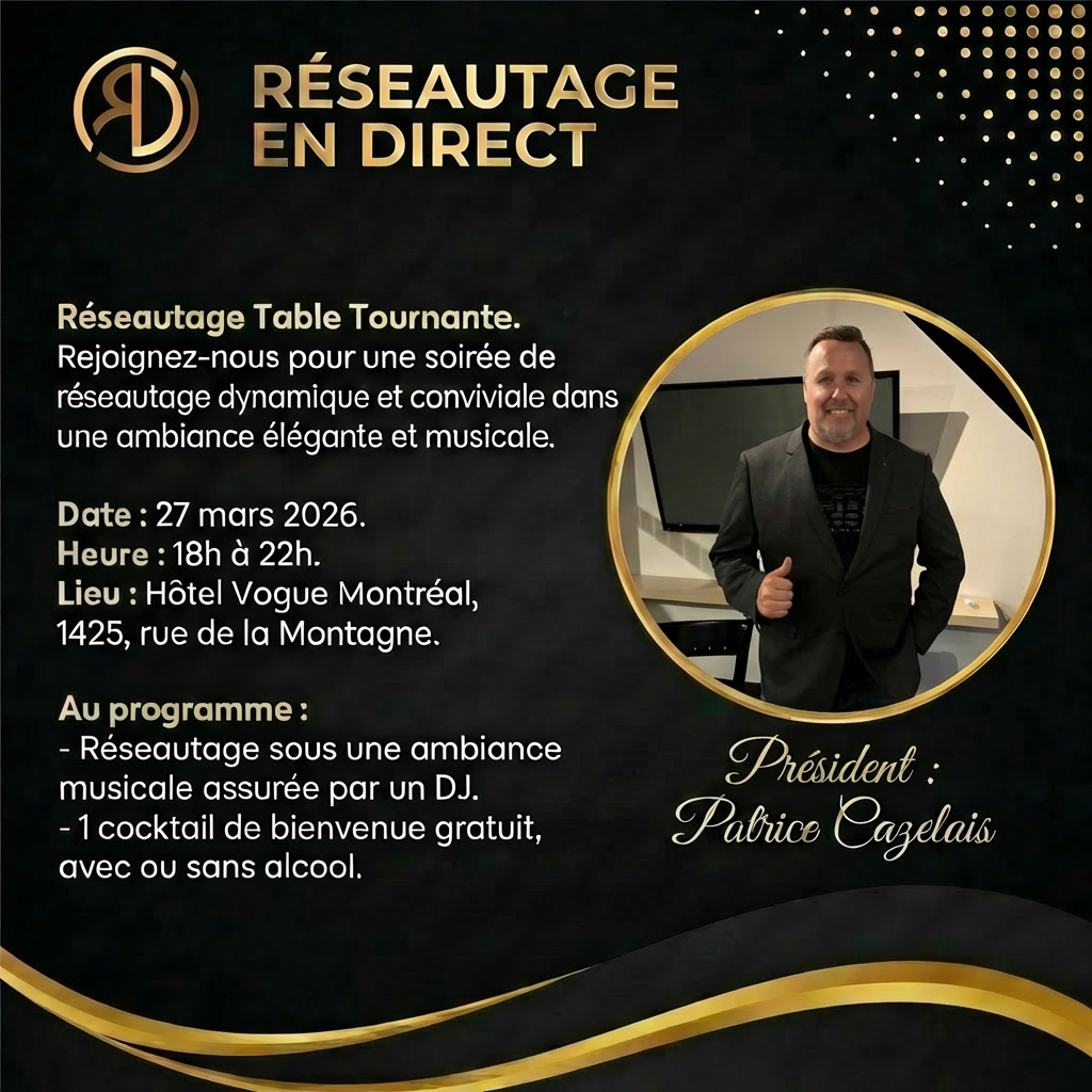 Réseautage en Direct vous invite à une soirée unique de réseautage en table tournante, pensée pour favoriser des échanges authentiques, dynamiques et efficaces entre entrepreneurs, professionnels et leaders d’affaires.