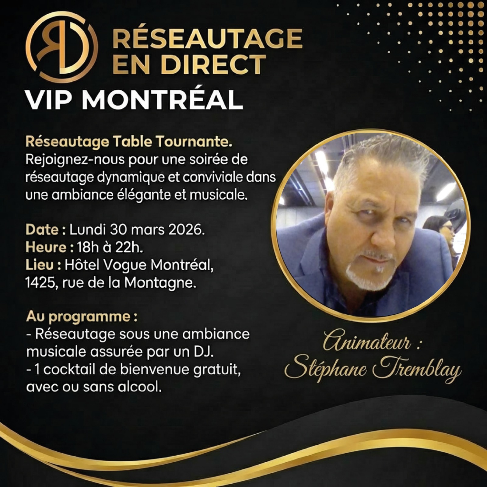 Réseautage en Direct vous invite à une soirée unique de réseautage en table tournante, pensée pour favoriser des échanges authentiques, dynamiques et efficaces entre entrepreneurs, professionnels et leaders d’affaires.