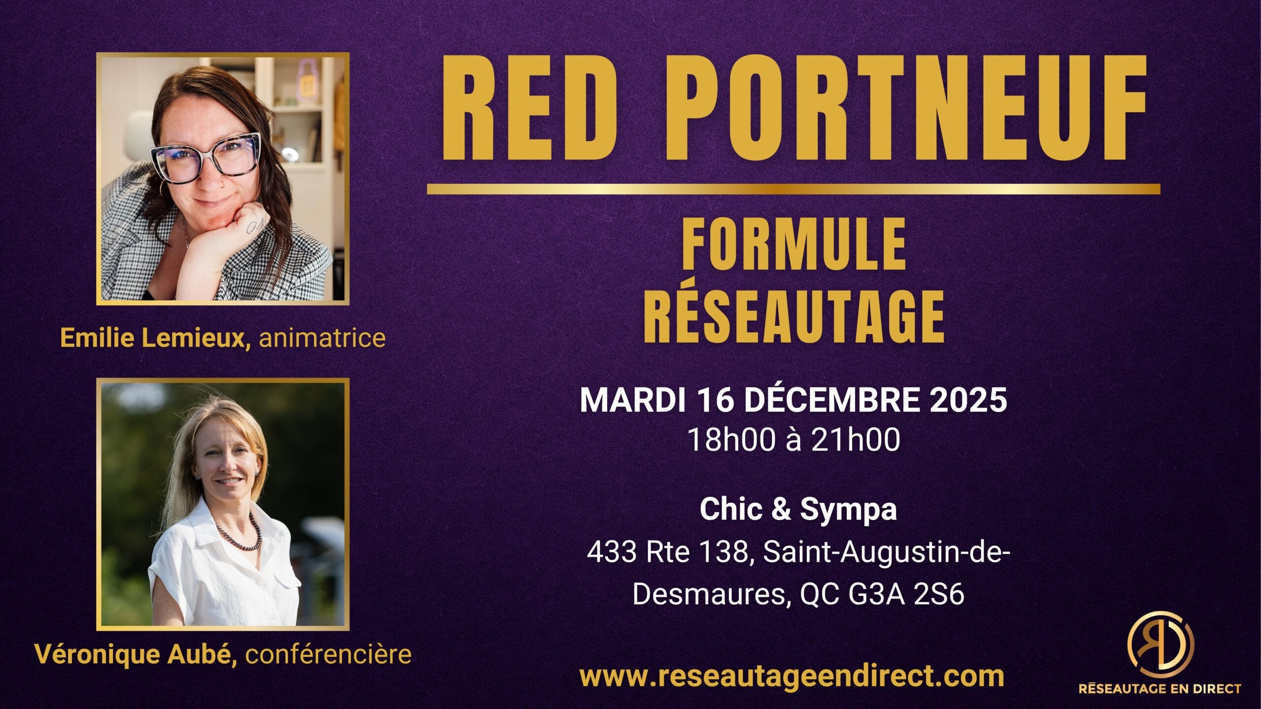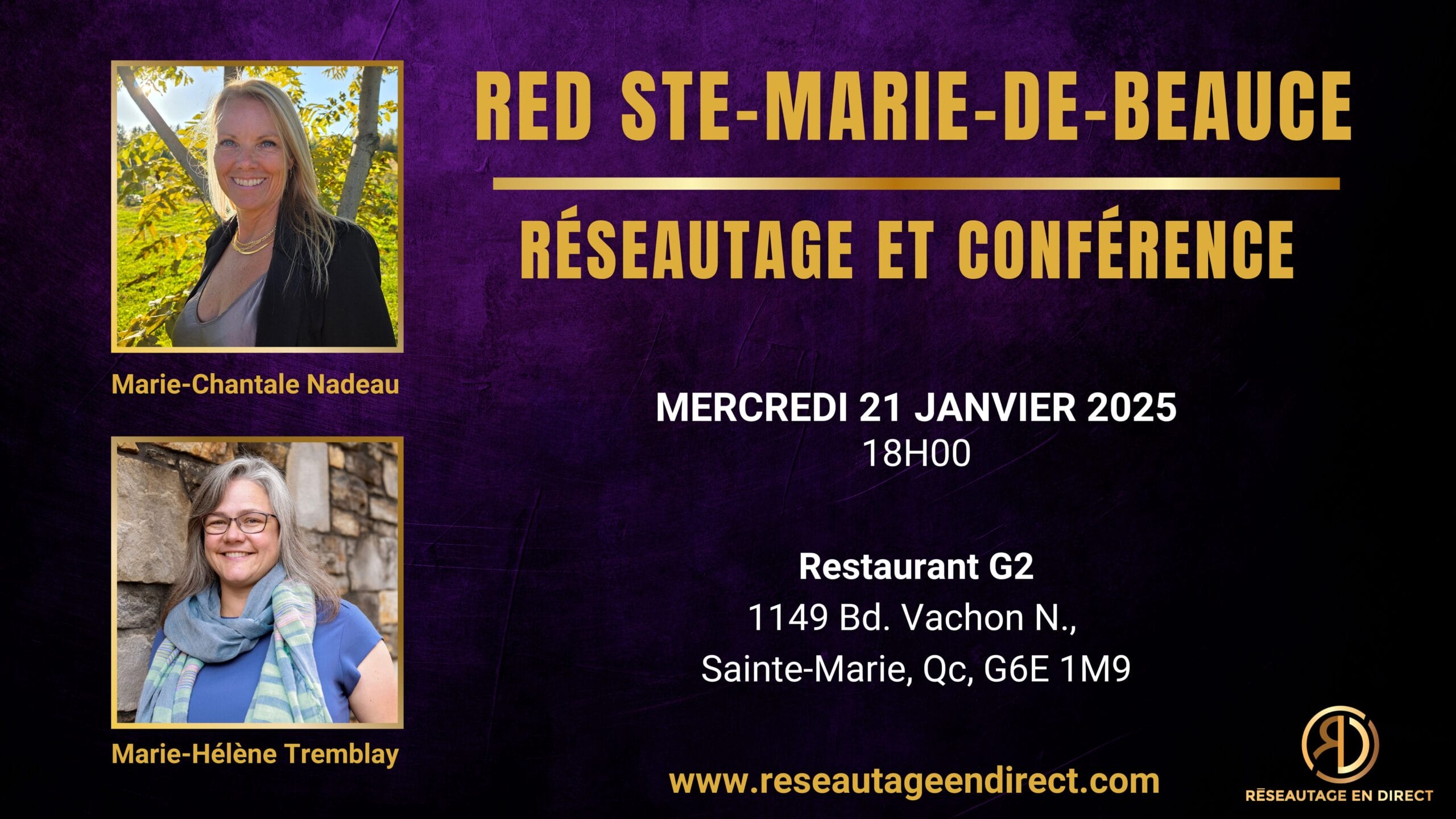 Bienvenue à notre RED en Beauce! Quand? : Mercredi le 10 décembre 2025, à partir de 18h30 Où? : Restaurant et bar St-Hubert - 16505 Bd Lacroix, Saint-Georges, QC G5Y 2G2 Animé par Claudia Duquet et Geneviève Bélanger Bienvenue à tous les entrepreneurs! Réservez votre place ici