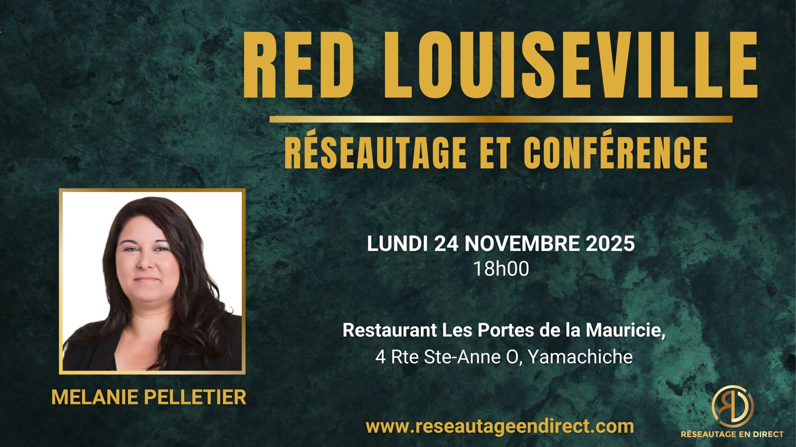 RED LOUISEVILLE 🔥 📅 Lundi 24 novembre à 18h📍 Restaurant Les Portes de la Mauricie, 4 Rte Ste-Anne O, Yamachiche🍽 Repas aux frais des participants Viens connecter avec d'autres entrepreneurs, échanger des idées et élargir ton réseau dans une ambiance conviviale et professionnelle. Une soirée inspirante animée par Melanie Pelletier! 🔗 Réserve ta place maintenant et fais partie du tout premier RED Louiseville! Réservez votre place ici
