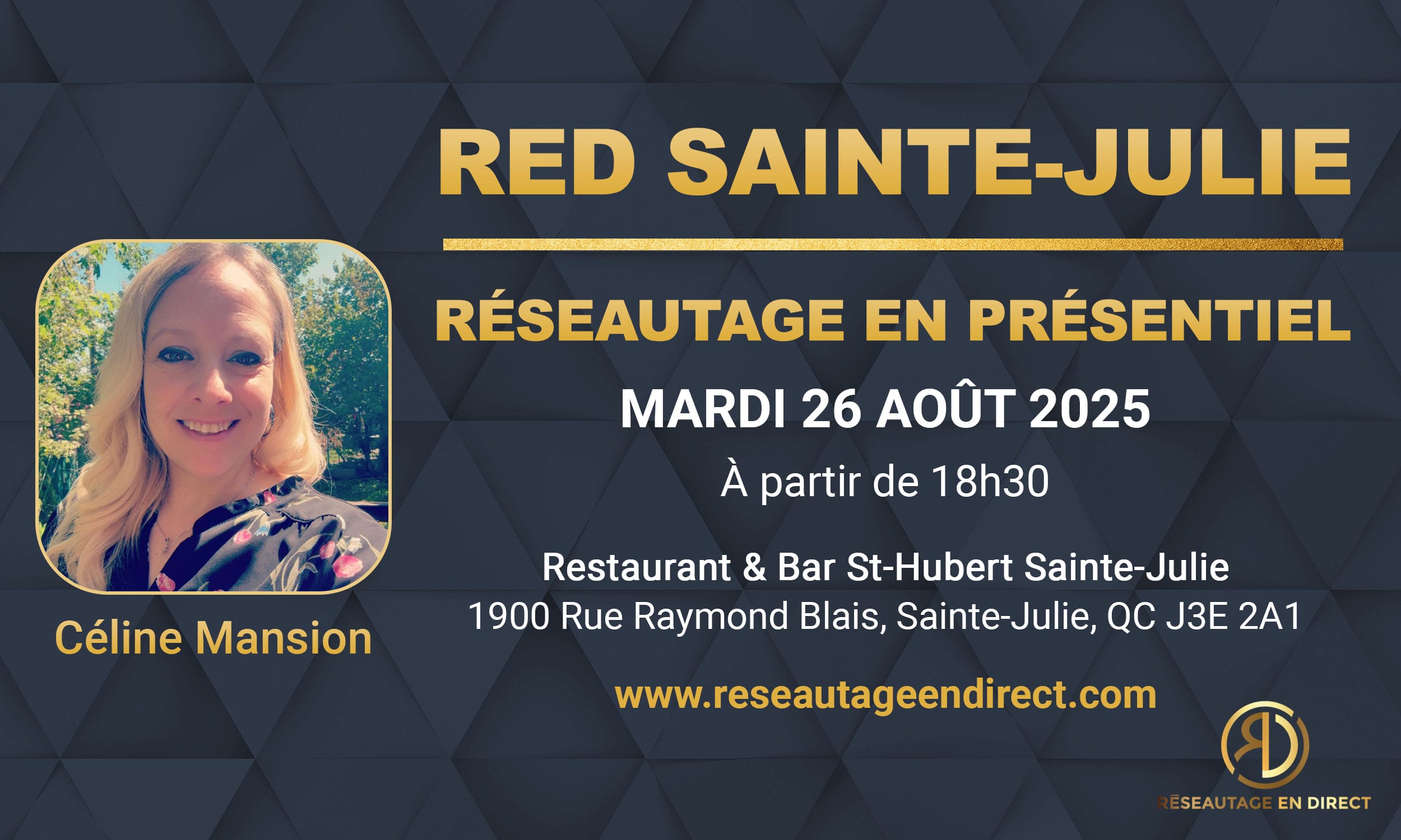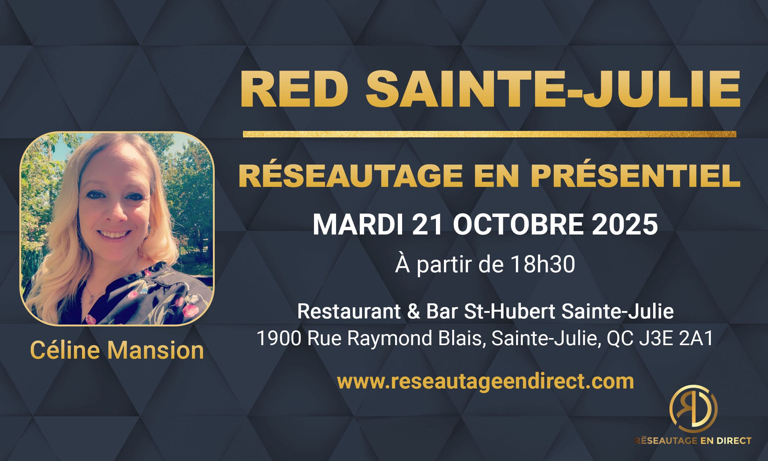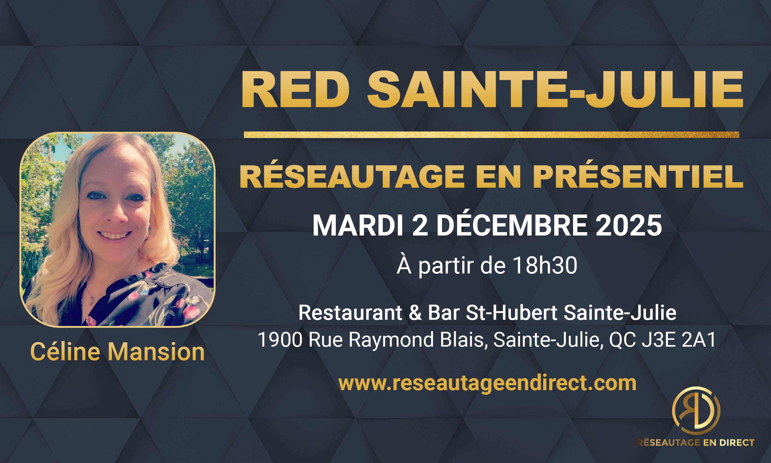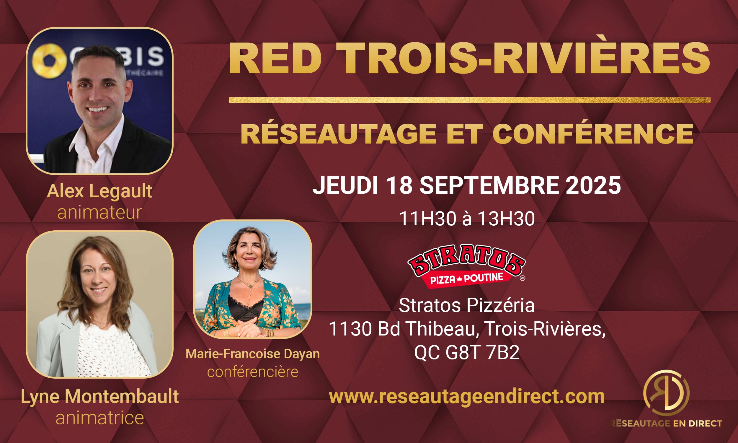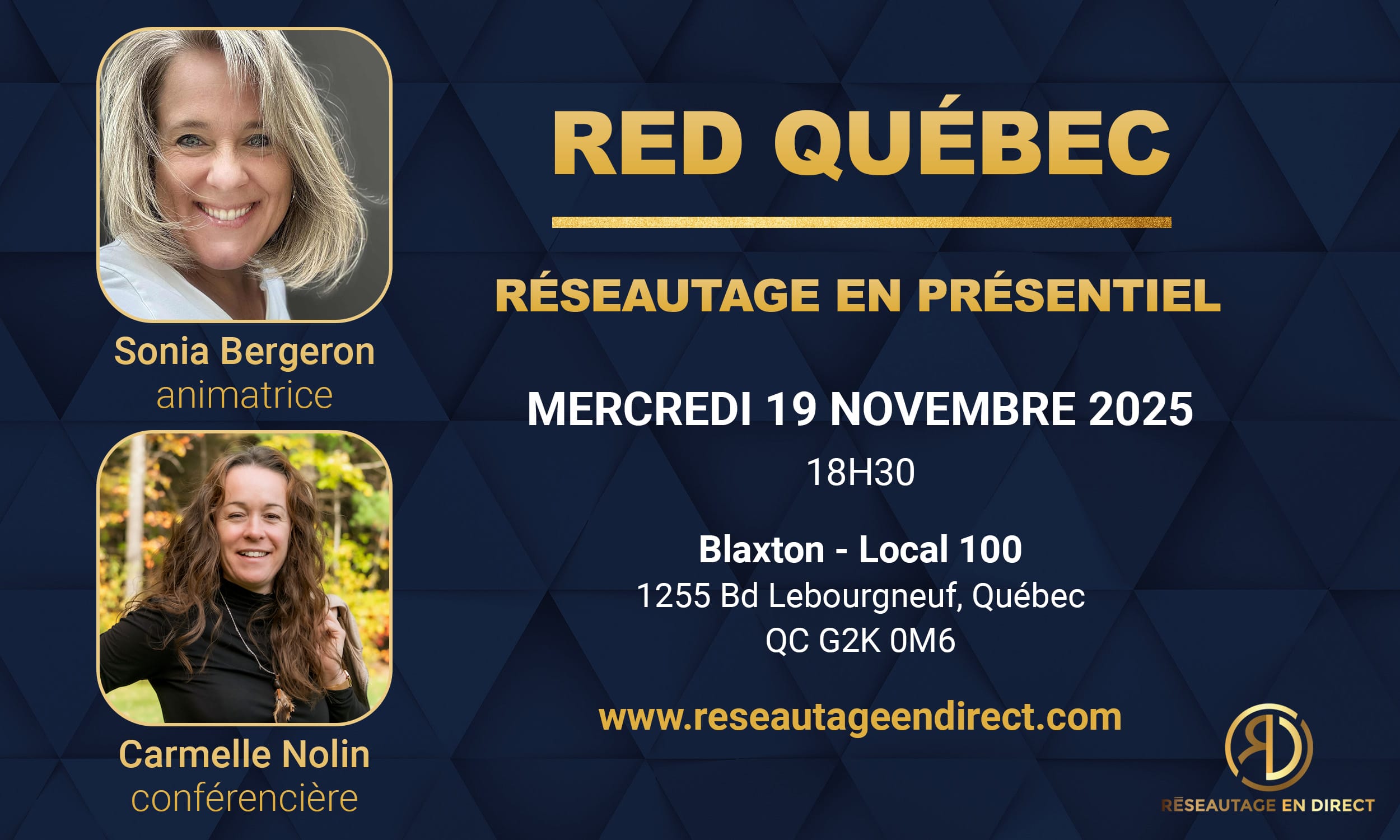 BIENVENUE AU RED QUÉBEC Jeudi 19 mars 2026 Lieu : Ginger Resto-Bar - 3031, boul Laurier, Québec  G1V 2M2 Heure : À partir de 18h30 Animé par Annie Lavallière Bienvenue à tous les entrepreneurs! Réservez votre place ici