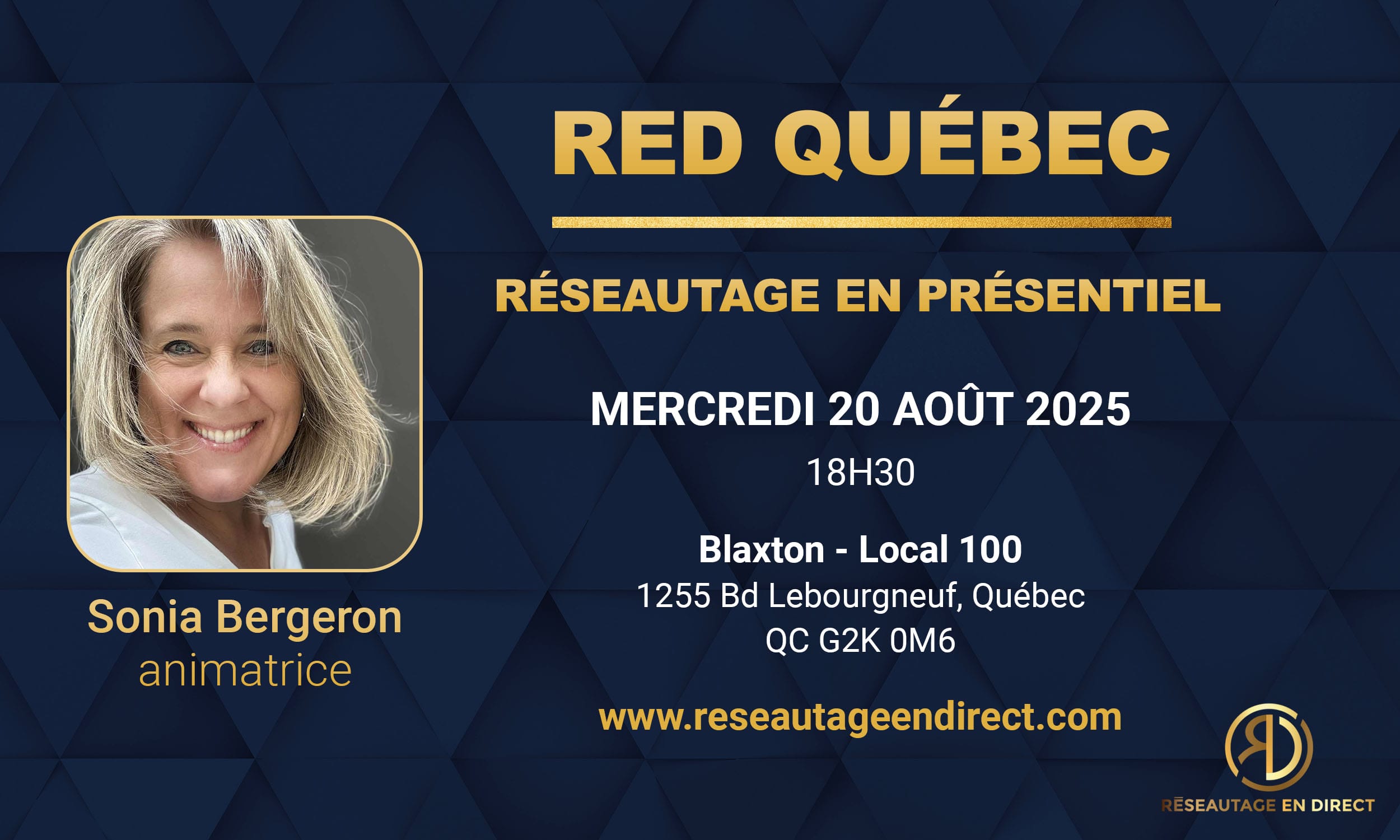 BIENVENUE AU RED QUÉBEC Jeudi 28 mai 2026 Lieu : Ginger Resto-Bar - 3031, boul Laurier, Québec  G1V 2M2 Heure : À partir de 18h30 Animé par Annie Lavallière Bienvenue à tous les entrepreneurs! Réservez votre place ici