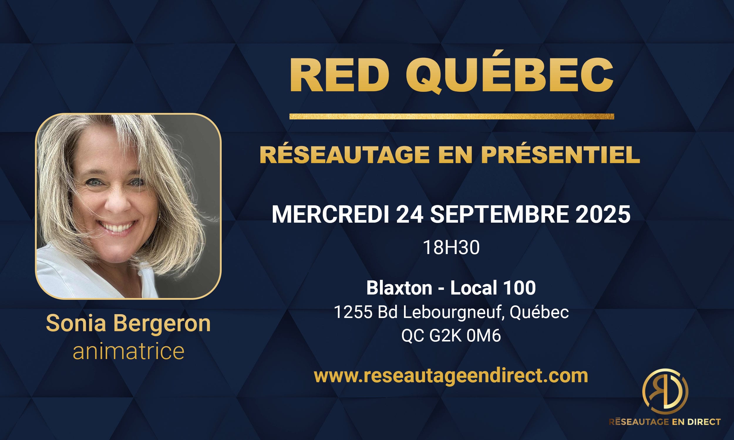 BIENVENUE AU RED QUÉBEC Jeudi 24 septembre 2026 Lieu : Ginger Resto-Bar - 3031, boul Laurier, Québec  G1V 2M2 Heure : À partir de 18h30 Animé par Annie Lavallière Bienvenue à tous les entrepreneurs! Réservez votre place ici