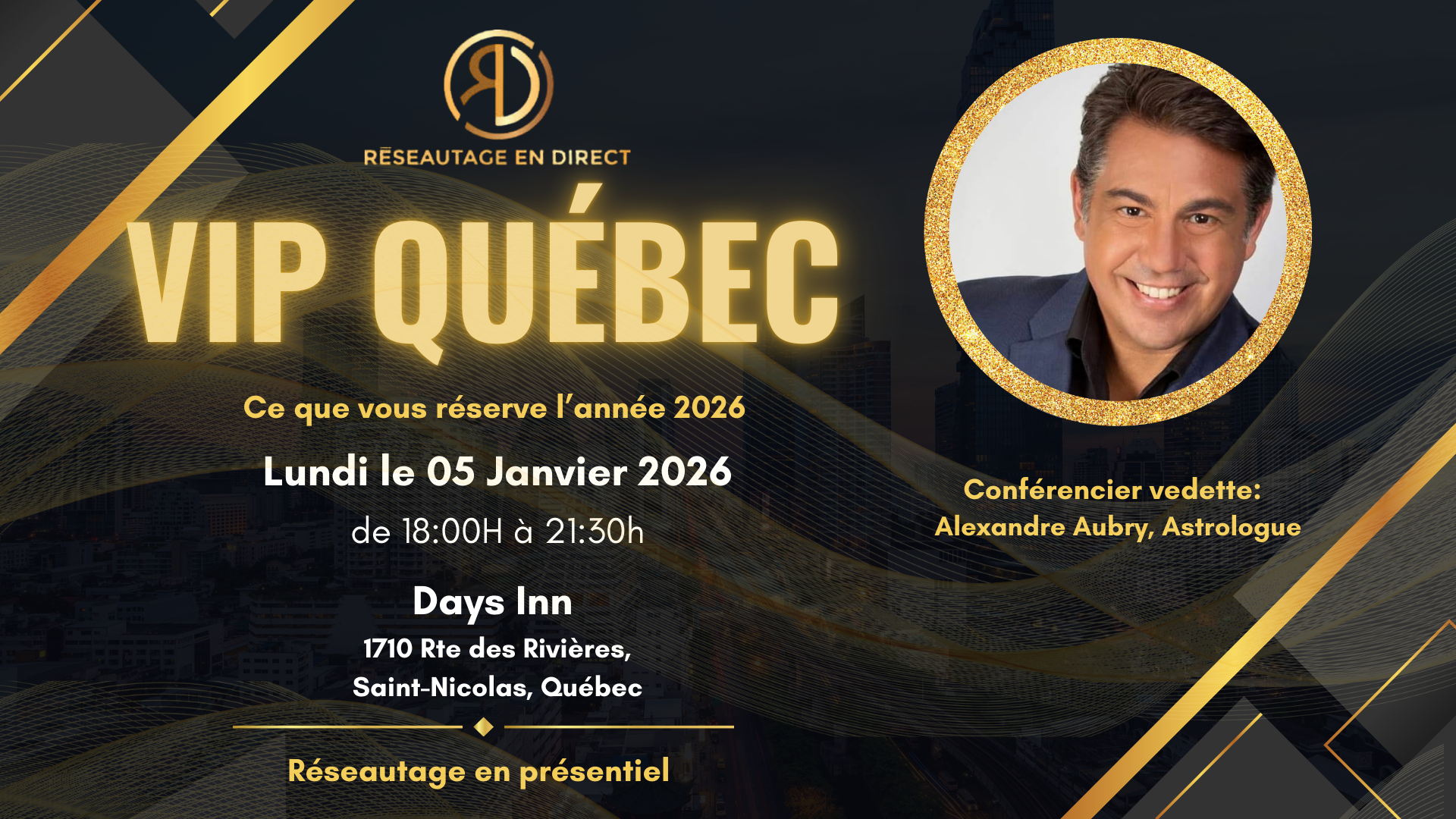 🌟 VIP QUÉBEC – Lundi 5 janvier 2026 Que vous réserve l’année 2026? Alexandre Aubry, astrologue reconnu, vous invite à une soirée exclusive à Québec pour décrypter les grandes tendances de l’année selon les signes astrologiques. 📍 Days Inn, Saint-Nicolas 🕕 18h à 21h30 Un réseautage en présentiel, éclairé par les étoiles. #VIPQuébec #Astrologie2026 #RéseautageEnDirect #REDQuébec #CeQueRéserve2026