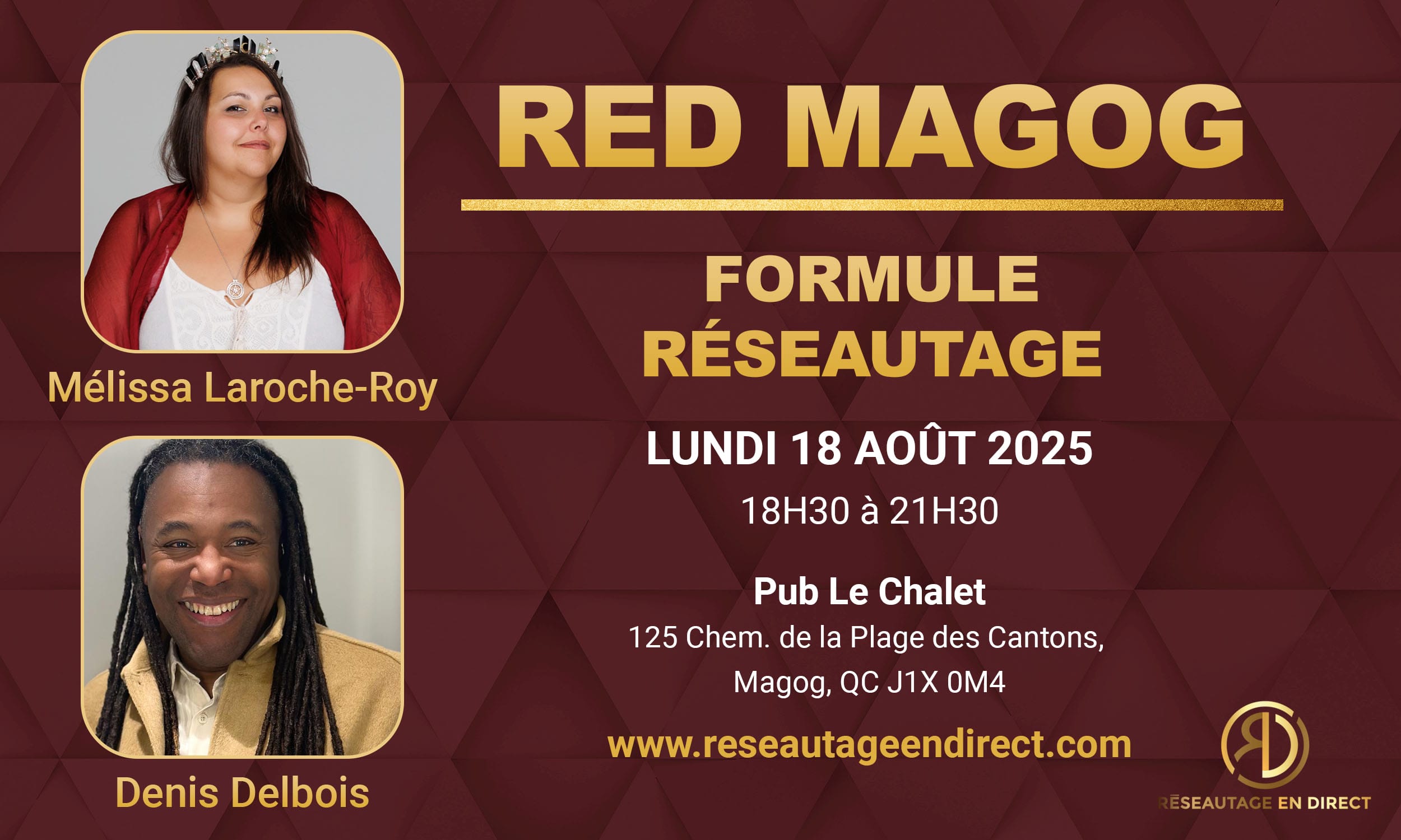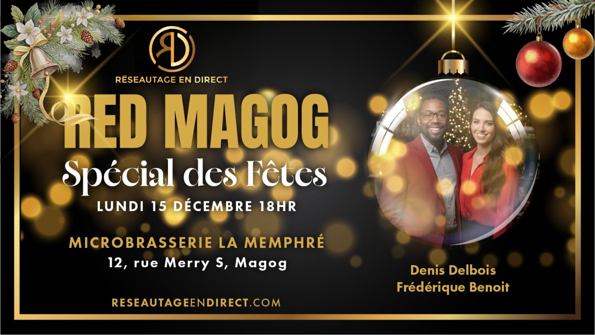 RED Magog Joignez-vous à nous pour notre réseautage à Magog ! 📅 Lundi 15 DECEMBRE 2025🕡 18h30📍 Microbrasserie La Memphré12, Rue Merry S, Magog, QUÉBEC ✨ Venez vivre l’expérience RED et créer des connexions puissantes dans une ambiance conviviale et inspirante.Une soirée sous la formule réseautage qui vous permettra d’élargir votre réseau et d’ouvrir de nouvelles opportunités. 👉 Animé par Denis Delbois 🚀 Places limitées – Réservez dès maintenant pour ne pas manquer cette soirée unique à Magog ! Réservez votre place ici