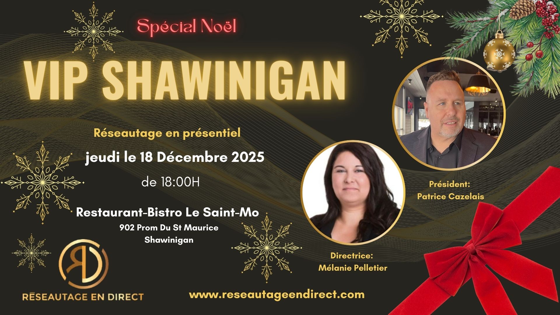 🎉 VIP à Shawinigan 🎉 📍 Le Saint-Mo Bistro Gourmand📅 Jeudi 18 décembre | 🕓 18:00h Joins-toi à nous pour une soirée inoubliable! 💼 De 18h à 21h : Réseautage VIP avec des entrepreneurs dynamiques de la région et tables tournantes animées par nos commanditaires Nos commanditaires : Jean-François Lusignan et Joanie Dufresne - Calfeutrage Double J Geneviève Marcouiller - IA Groupe Financier Laurie Pépin - RE/MAX 1er CHOIX Le Saint-Mo Bistro Gourmand Ariane PM - Équilibre chez soi Carmelle Nolin - Relation d'aide Sébastien Pothier - Konnecta Inc. ✨ Un rendez-vous à ne pas manquer ! Animé par la dynamique Mélanie Pelletier 📣 Places limitées – réserve vite ta place! *Souper au frais des participants Réservez votre place ici