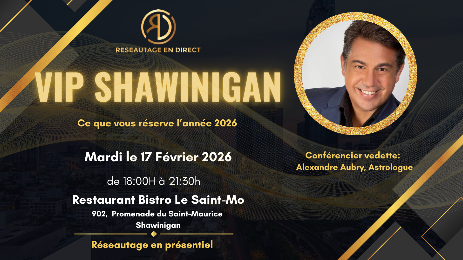 VIP SHAWINIGAN -  RESERVEZ-ICI! 📍 Le Saint-Mo Bistro Gourmand📅 Mardi 17 Février 2026| 🕓 18h à 21:30h 🌟 VIP SHAWINIGAN – Mardi 17 février 2026 Les étoiles vous parlent… écoutez-les! Alexandre Aubry vous dévoile les clés astrologiques de 2026 dans une ambiance conviviale. 📍 Bistro Le Saint-Mo, Promenade du Saint-Maurice 🕕 18h à 21h30 Un réseautage intuitif et éclairant. #VIPShawinigan #Astrologie2026 #REDShawi #CeQueRéserve2026 #RéseautageIntuitif Nos commanditaires : Jean-François Lusignan et Joanie Dufresne - Calfeutrage Double J Geneviève Marcouiller - IA Groupe Financier Laurie Pépin - RE/MAX 1er CHOIX Le Saint-Mo Bistro Gourmand Ariane PM - Équilibre chez soi Carmelle Nolin - Relation d'aide Sébastien Pothier - Konnecta Inc. ✨ Un rendez-vous à ne pas manquer ! 📣 Places limitées – réserve vite ta place! *Souper au frais des participants Réservez votre place ici