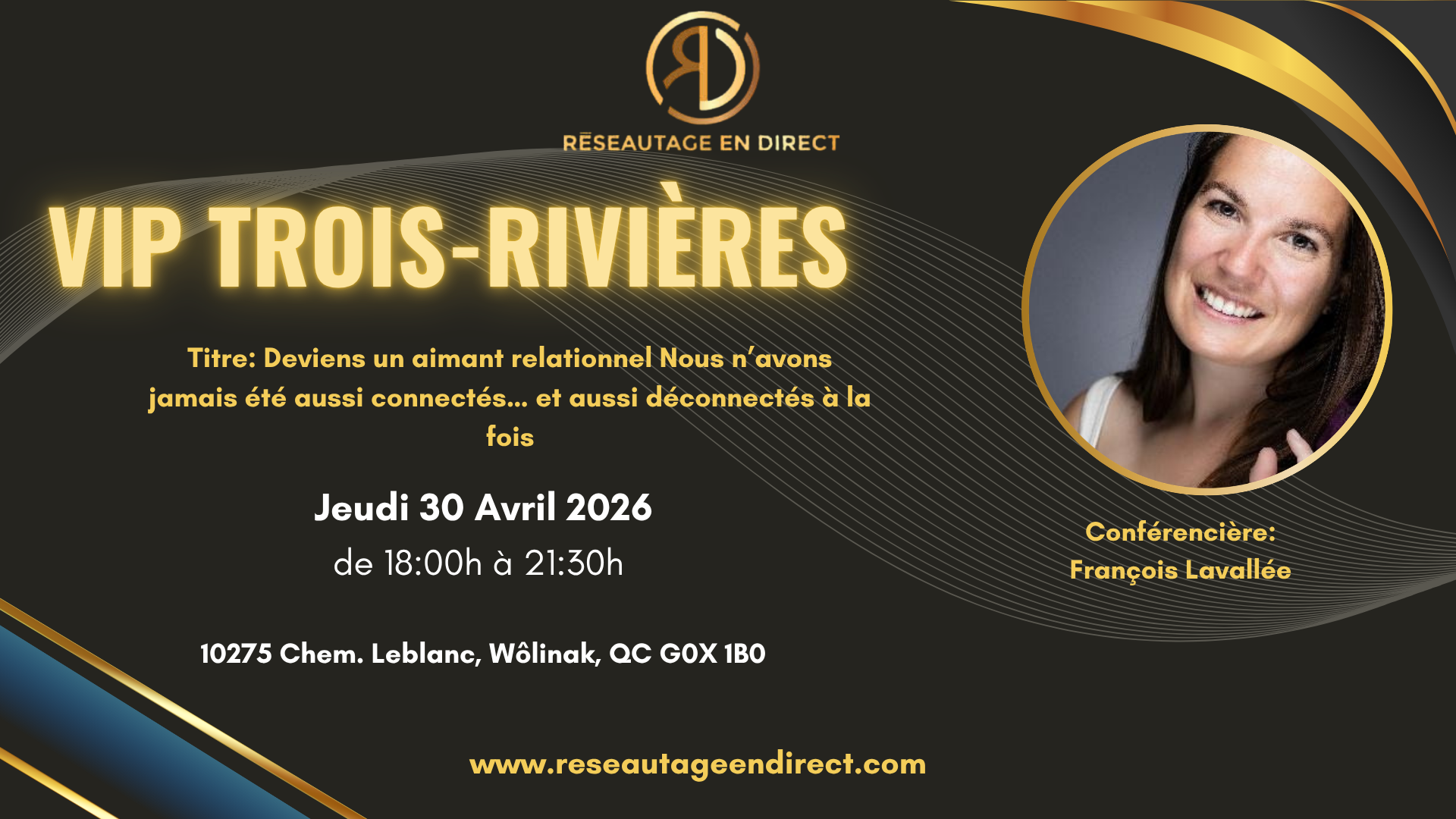 Le 4 mai 2026, rejoignez la communauté VIP Québec pour une soirée de réseautage en présentiel et une conférence inspirante avec Marie Françoise Dayan.