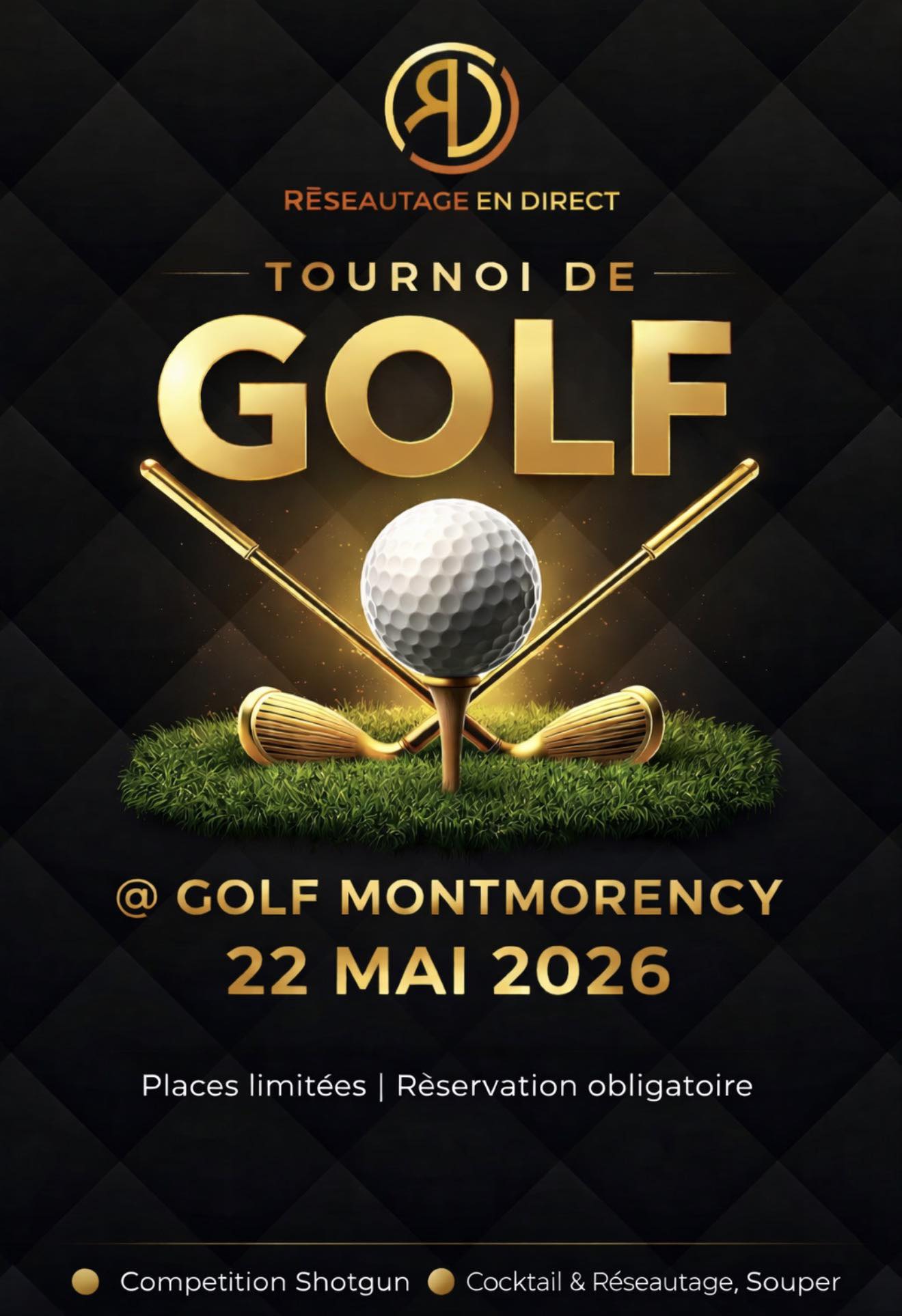 Le 22 mai 2026, Réseautage en Direct t’invite à un tournoi exceptionnel au Golf Montmorency.