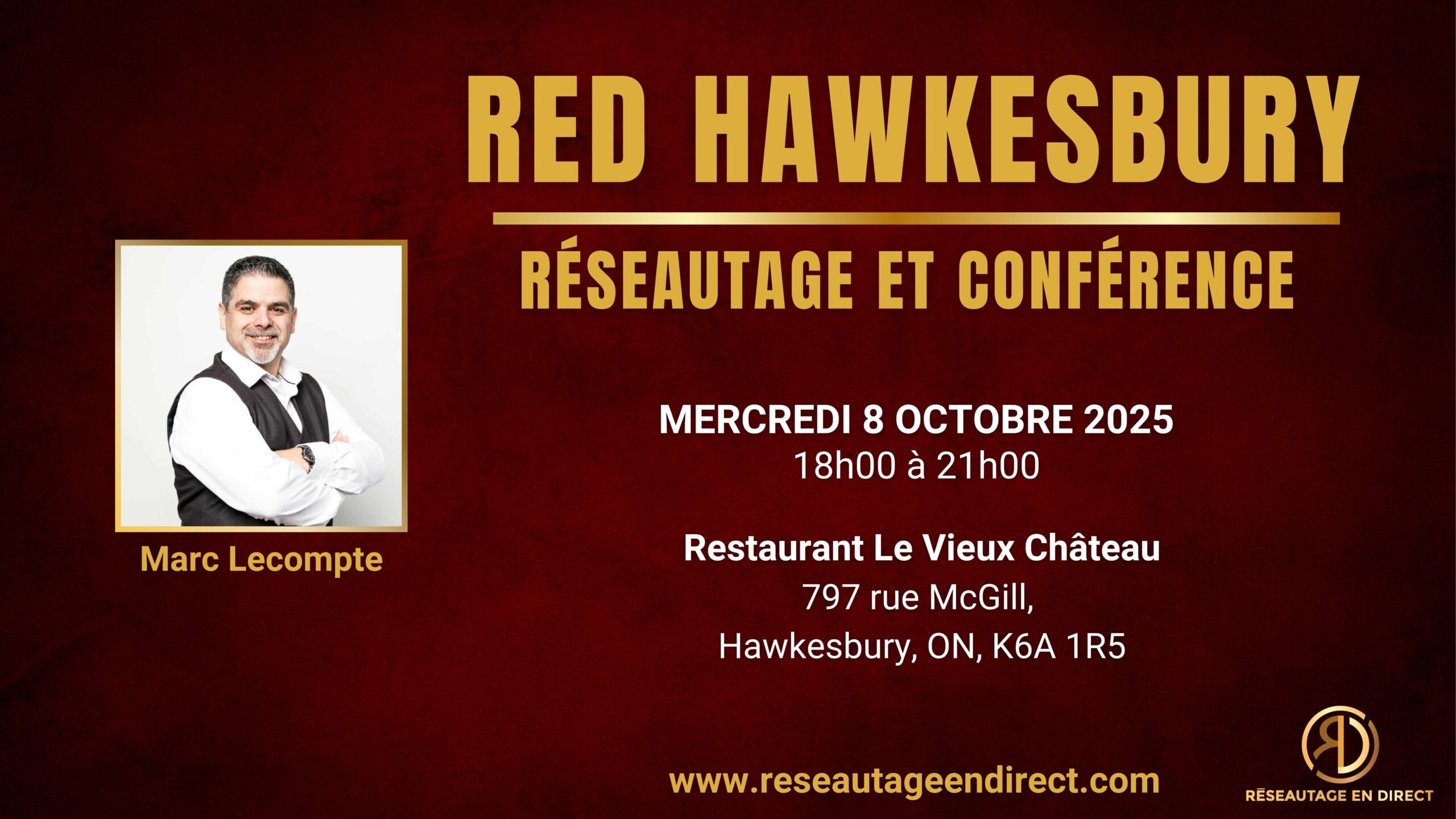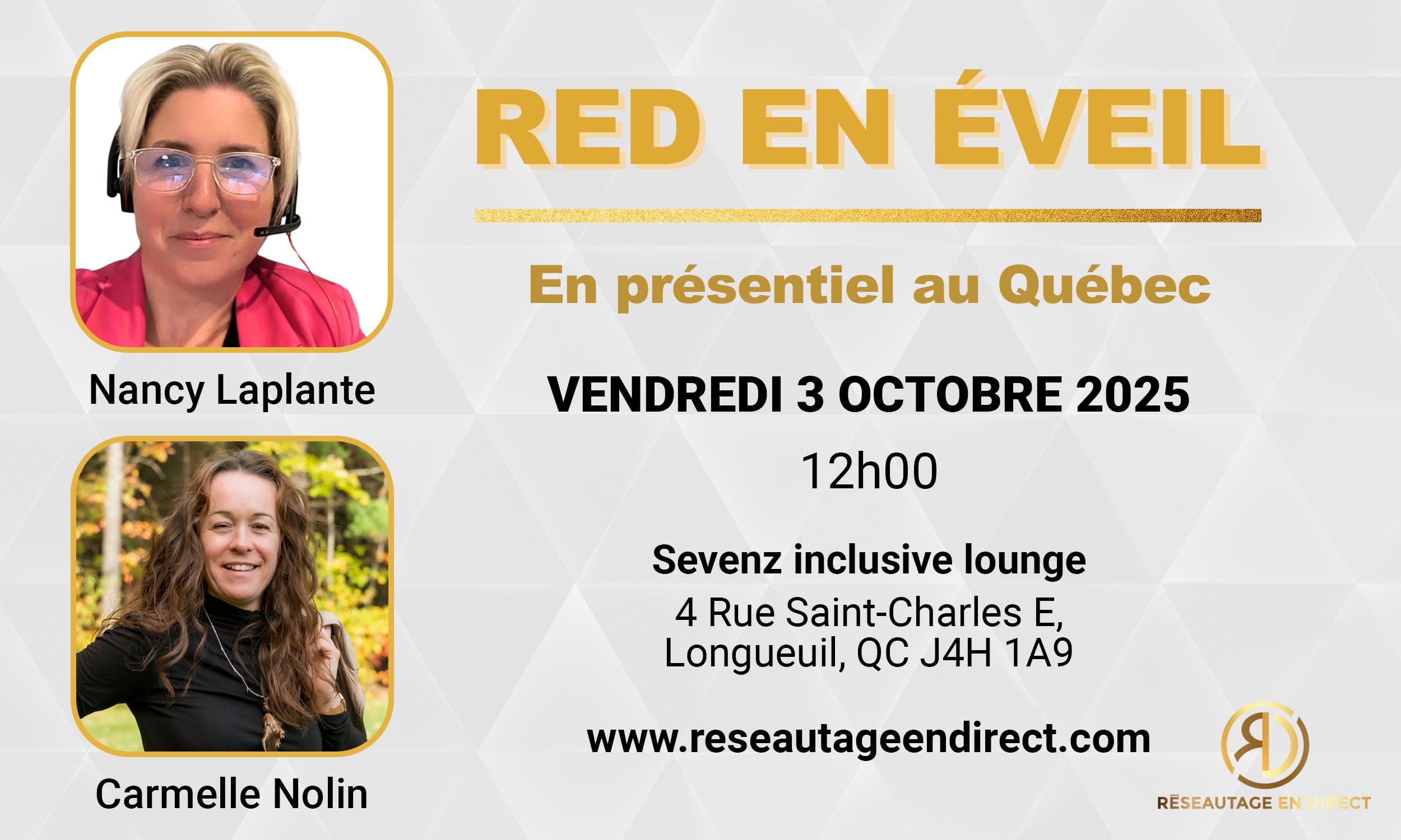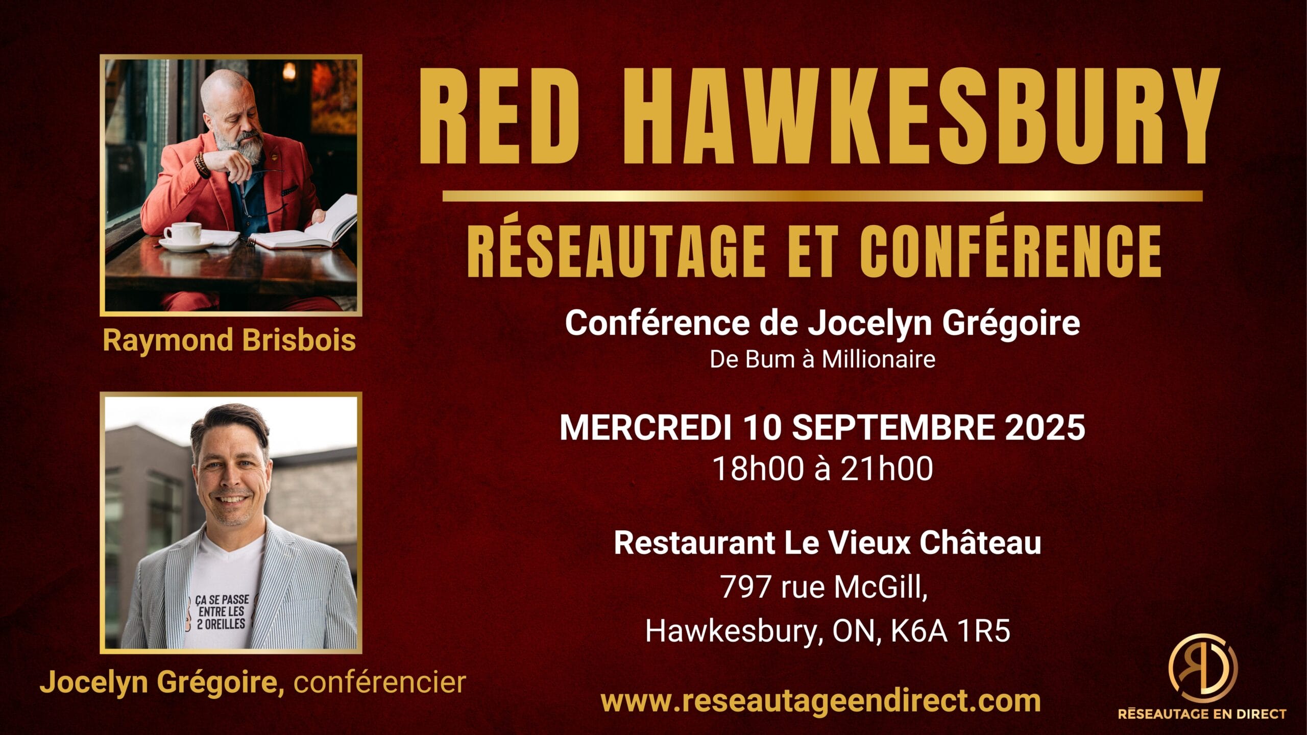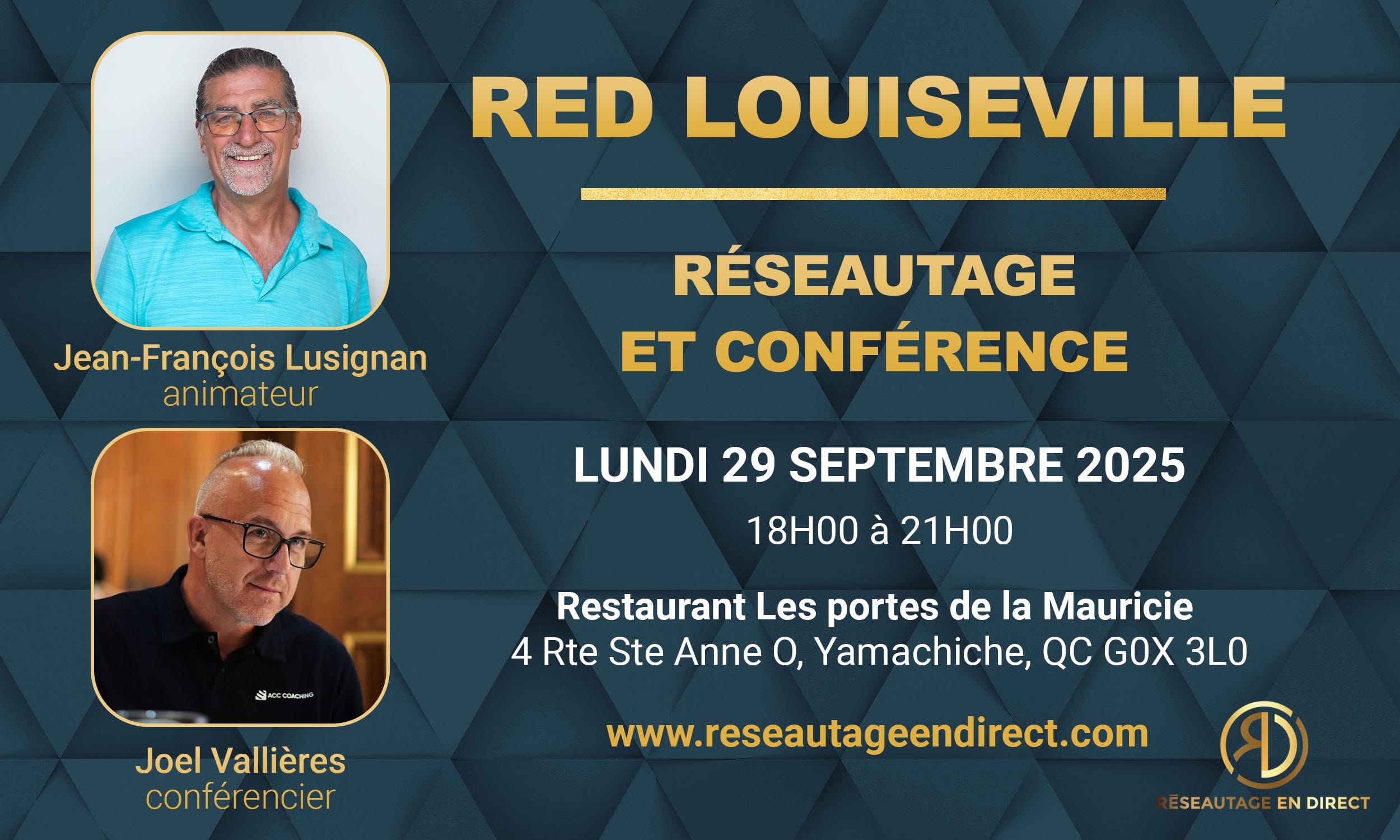 Le Saint-Mo Bistro Gourmand 902 Prom Du St Maurice,Shawinigan,Québec,CanadaBienvenue à notre RED SHAWINIGAN Soyez des nôtres en grand nombre pour connecter avec des entrepreneurs de votre région! Ce sera l’occasion de présenter vos entreprises et services en plus d’assister à une conférence captivante et repartir avec des outils pratiques à appliquer dans vos entreprises. 📅 Quand : 7 août 2025 📍 Où : Le Saint-Mo Bistro Gourmand, Shawinigan Conférence de Véronique Julien : J'existe ! Un témoignage inspirant d’un parcours vers la liberté et la joie de vivre. Après avoir surmonté de grands défis et vaincu ses peurs, l’oratrice a choisi de changer, d’exister pleinement et de servir l’humanité. Par son histoire de résilience, d’amour et de pardon, elle invite chacun à prendre soin de soi et à oser demander de l’aide, car le courage et le soutien sont essentiels pour mieux vivre. Ne manquez pas cette occasion unique d'être inspiré par des experts et de découvrir comment vous pouvez transformer votre vie et vos investissements. ✨ Inscrivez-vous maintenant et faites partie du changement ! ✨ ANIMATEUR: Alex Legault Réservez votre place ici