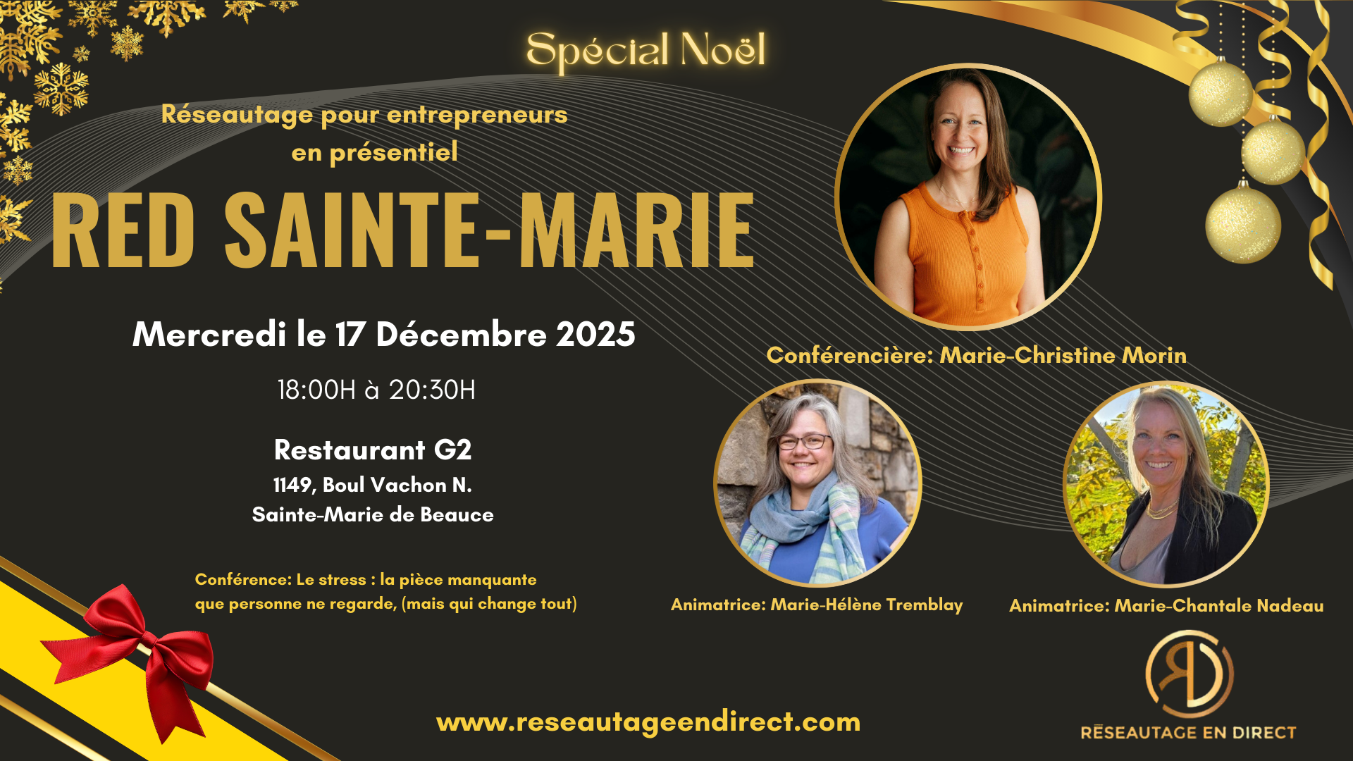 BIENVENUE AU RED QUÉBEC Jeudi 17 décembre 2026 Lieu : Ginger Resto-Bar - 3031, boul Laurier, Québec  G1V 2M2 Heure : À partir de 18h30 Animé par Annie Lavallière Bienvenue à tous les entrepreneurs! Réservez votre place ici